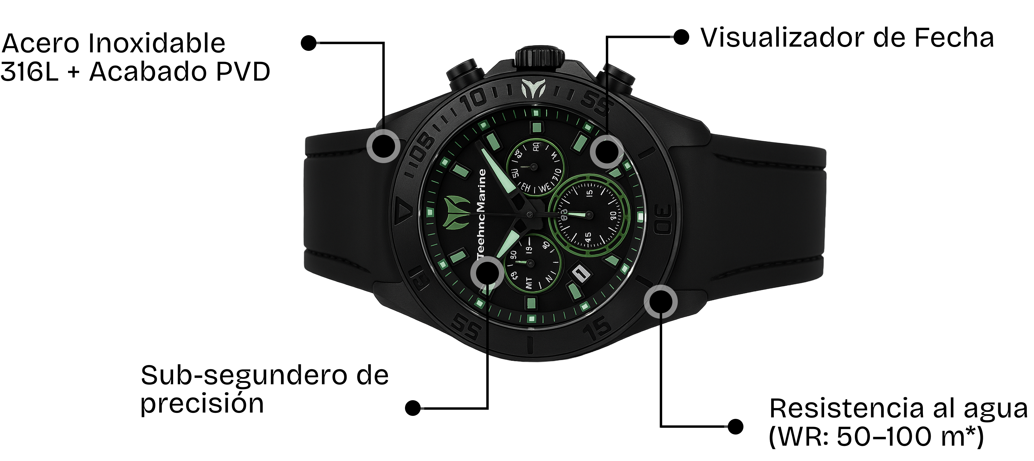 Reloj deportivo de alto desempeño con movimiento de cuarzo suizo, caja en acero inoxidable 316L con acabado PVD, cristal mineral endurecido, sub-segundero y fecha, y correa de silicona hipoalergénica. Componentes que trabajan en sinergia para entregar precisión, durabilidad y confort activo en el día a día.